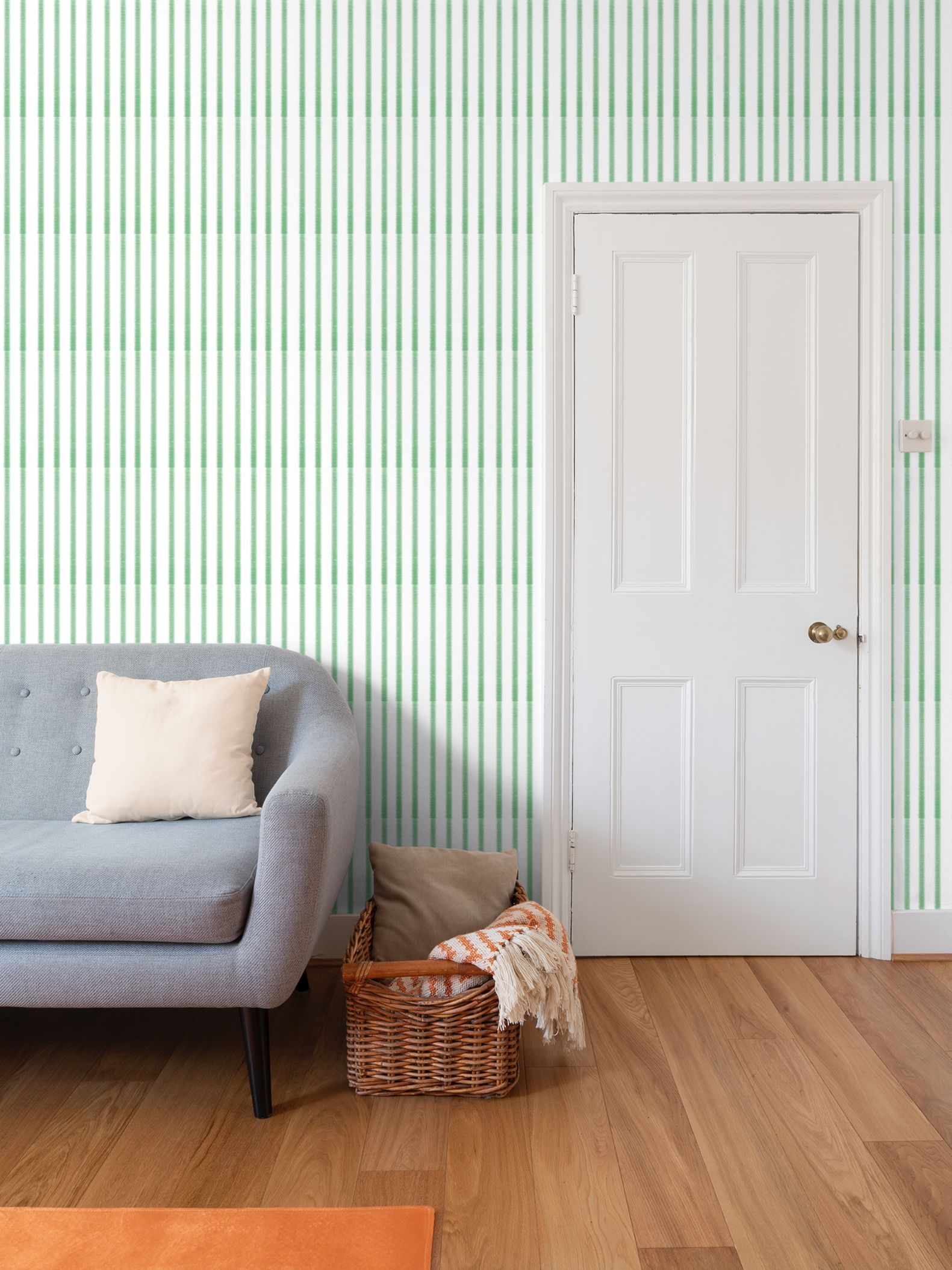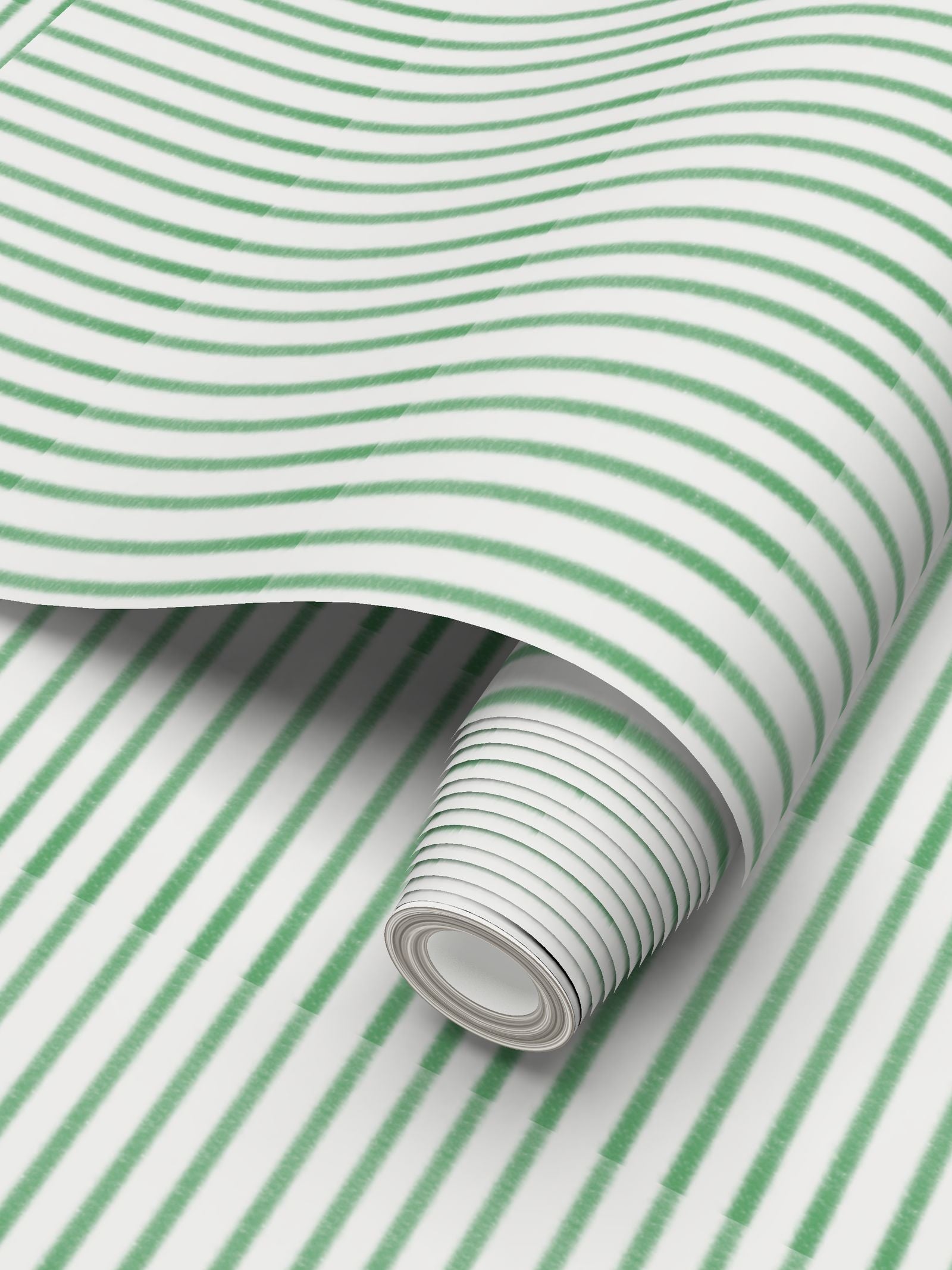 This wallpaper features a clean, modern stripe design inspired by the natural elegance of bamboo. Vertical green lines on a soft white background evoke a fresh, airy feel—perfect for creating a calm, organic look in kitchens, bathrooms, or sunrooms. Its repeat pattern brings balance and simplicity, blending nature-inspired serenity with timeless style.