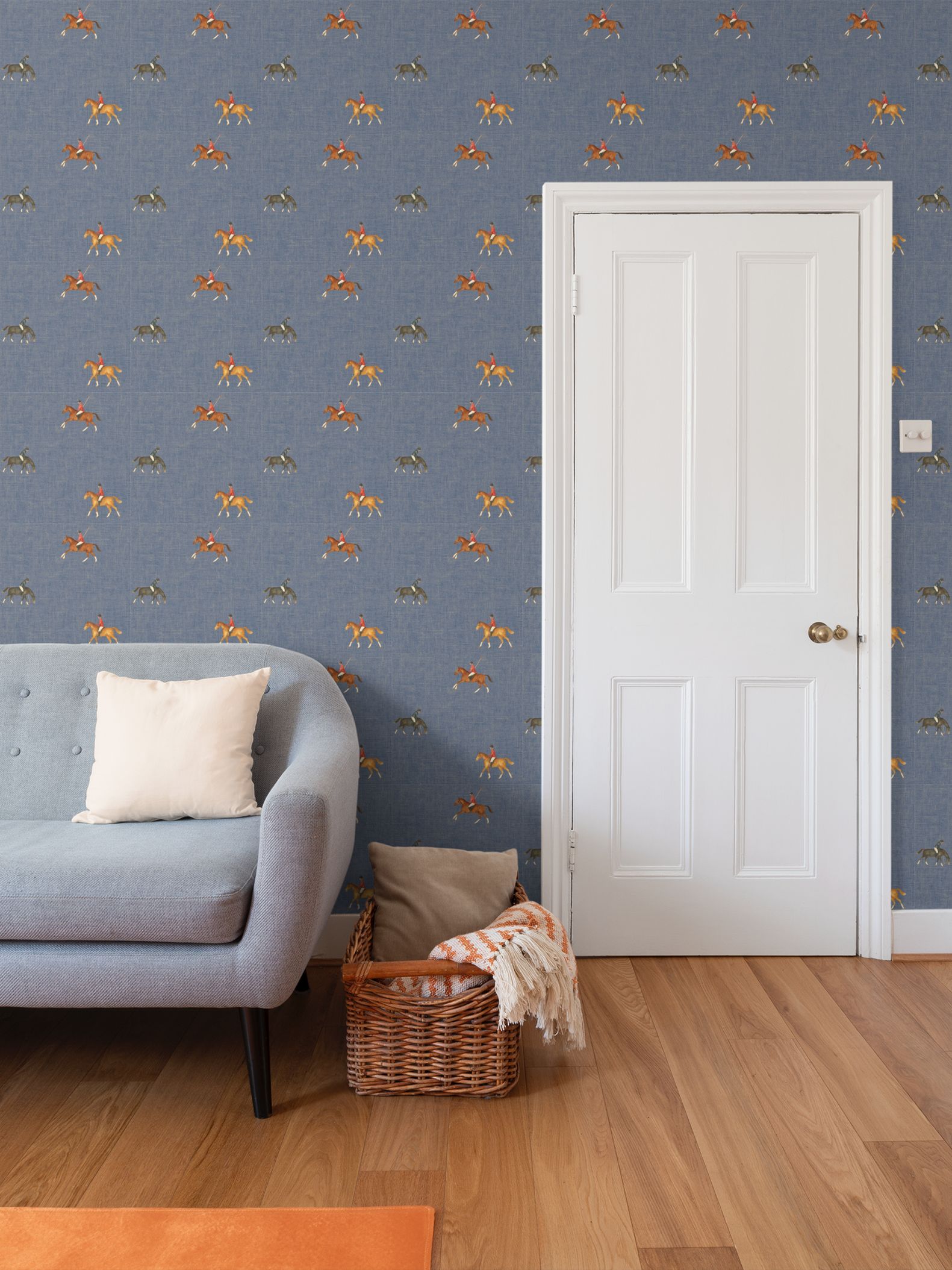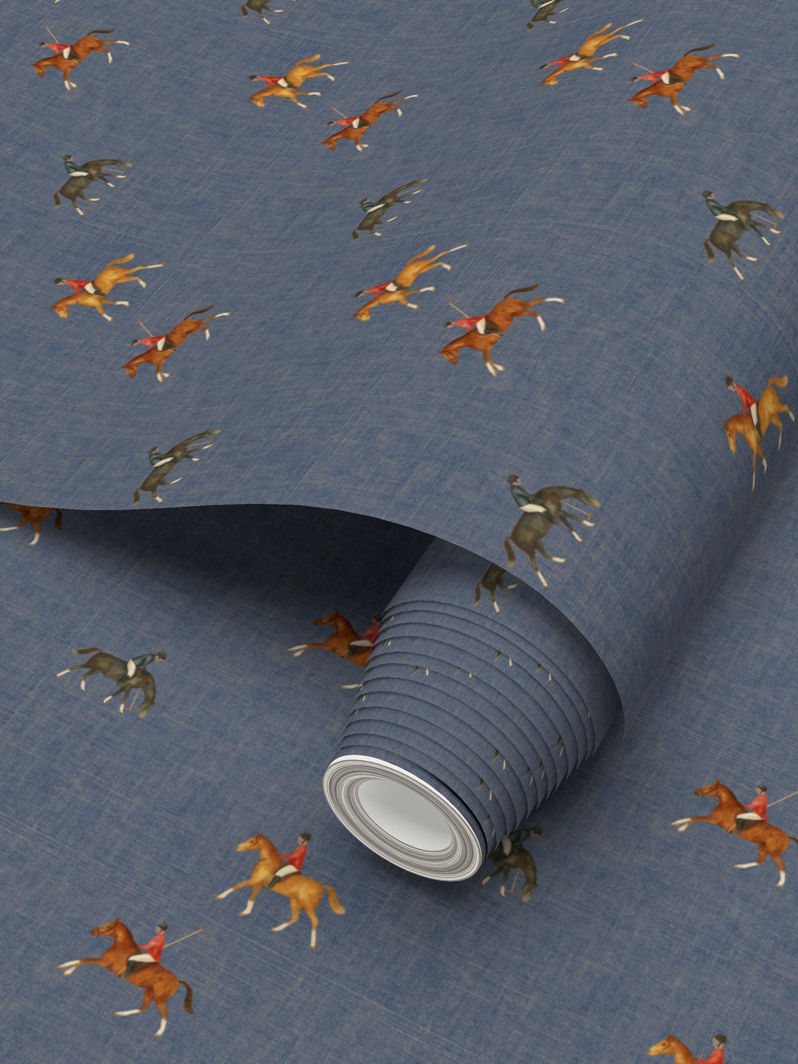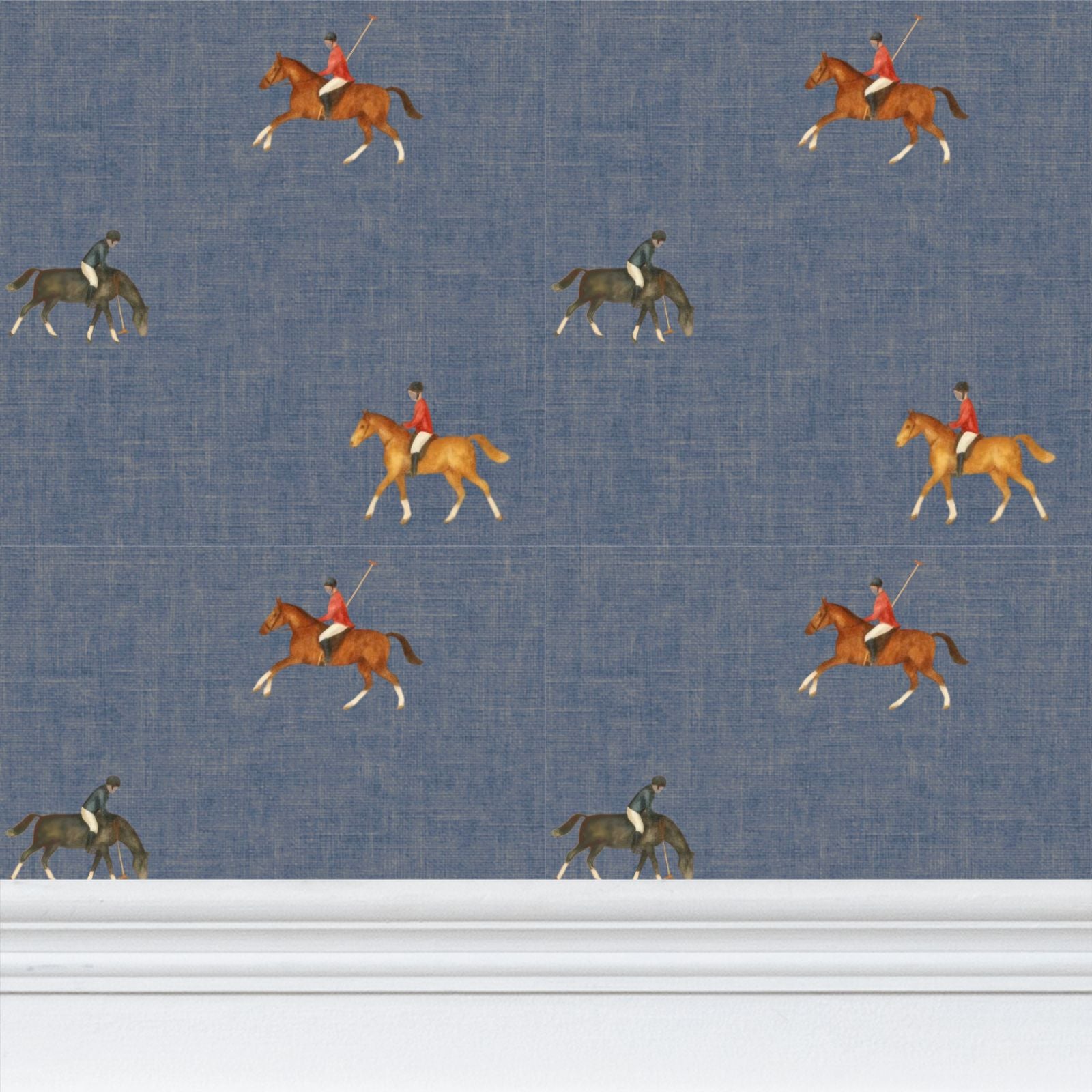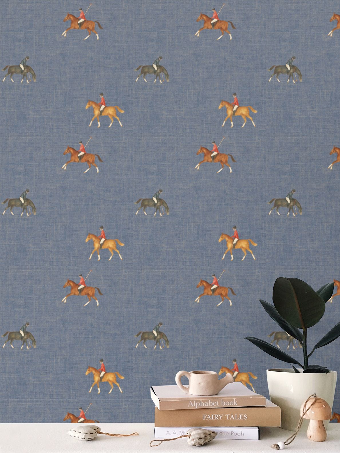 A refined equestrian wallpaper featuring hand-painted riders and their horses in classic hunt and schooling poses. The artwork has a timeless, sporting-heritage feel with a soft, illustrative touch. Perfect for studies, mudrooms, tack rooms, children's spaces, or anywhere a subtle nod to the equestrian lifestyle is desired.