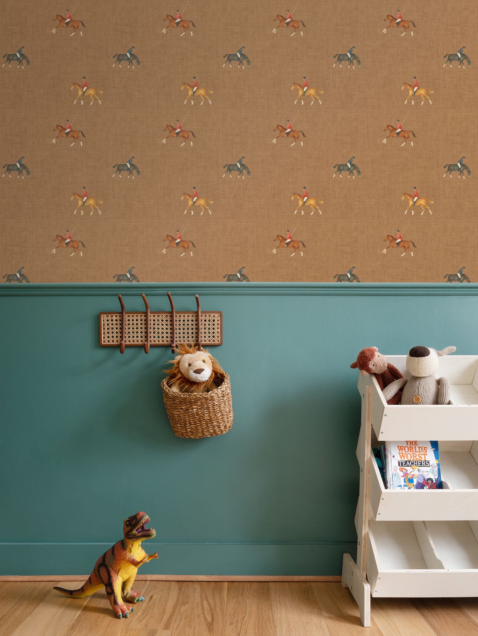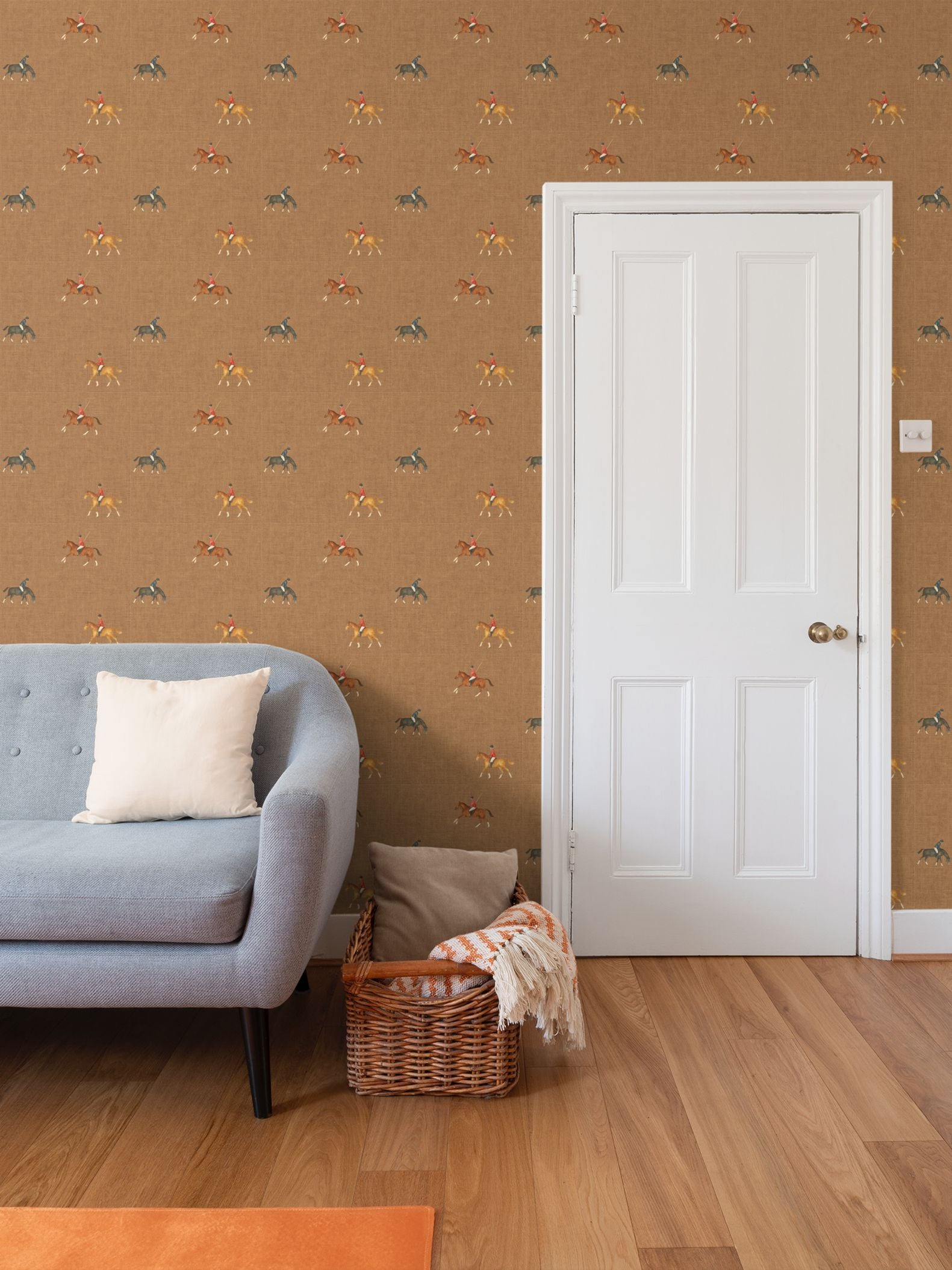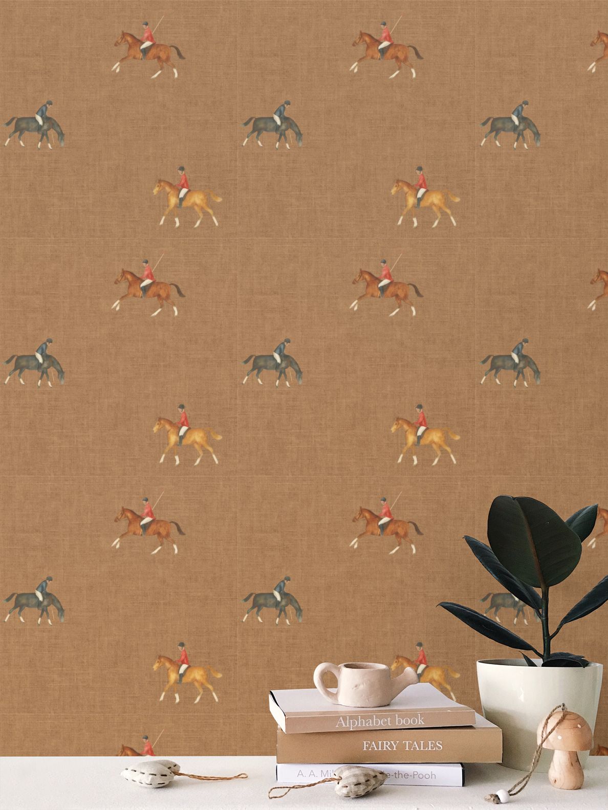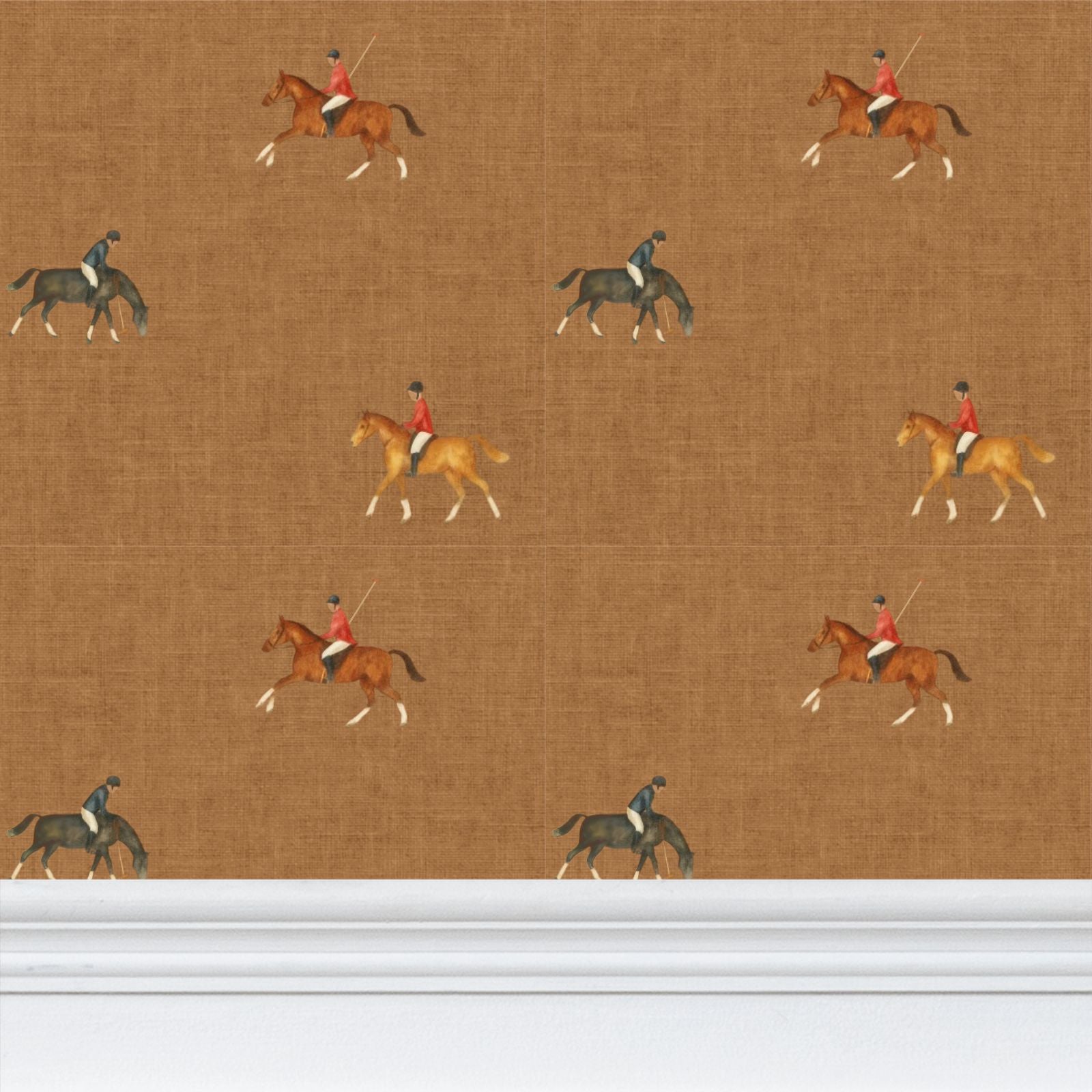 A refined equestrian wallpaper featuring hand-painted riders and their horses in classic hunt and schooling poses. The artwork has a timeless, sporting-heritage feel with a soft, illustrative touch. Perfect for studies, mudrooms, tack rooms, children's spaces, or anywhere a subtle nod to the equestrian lifestyle is desired.