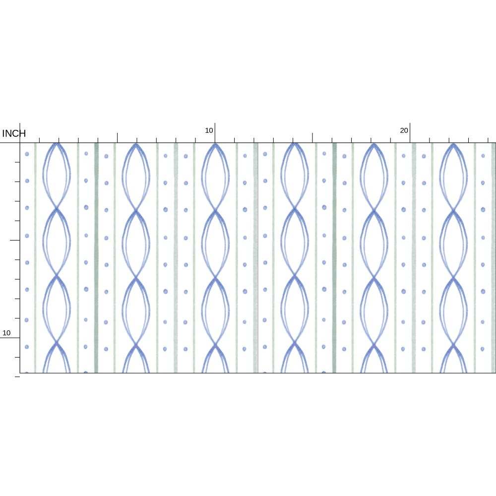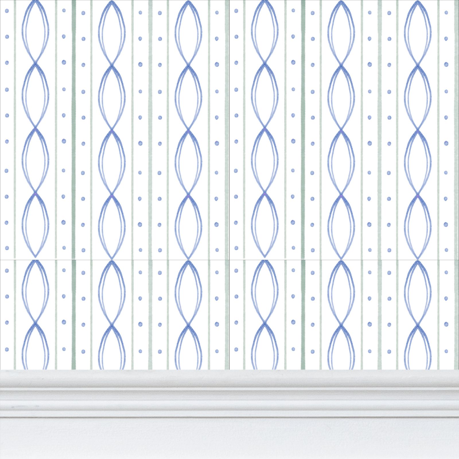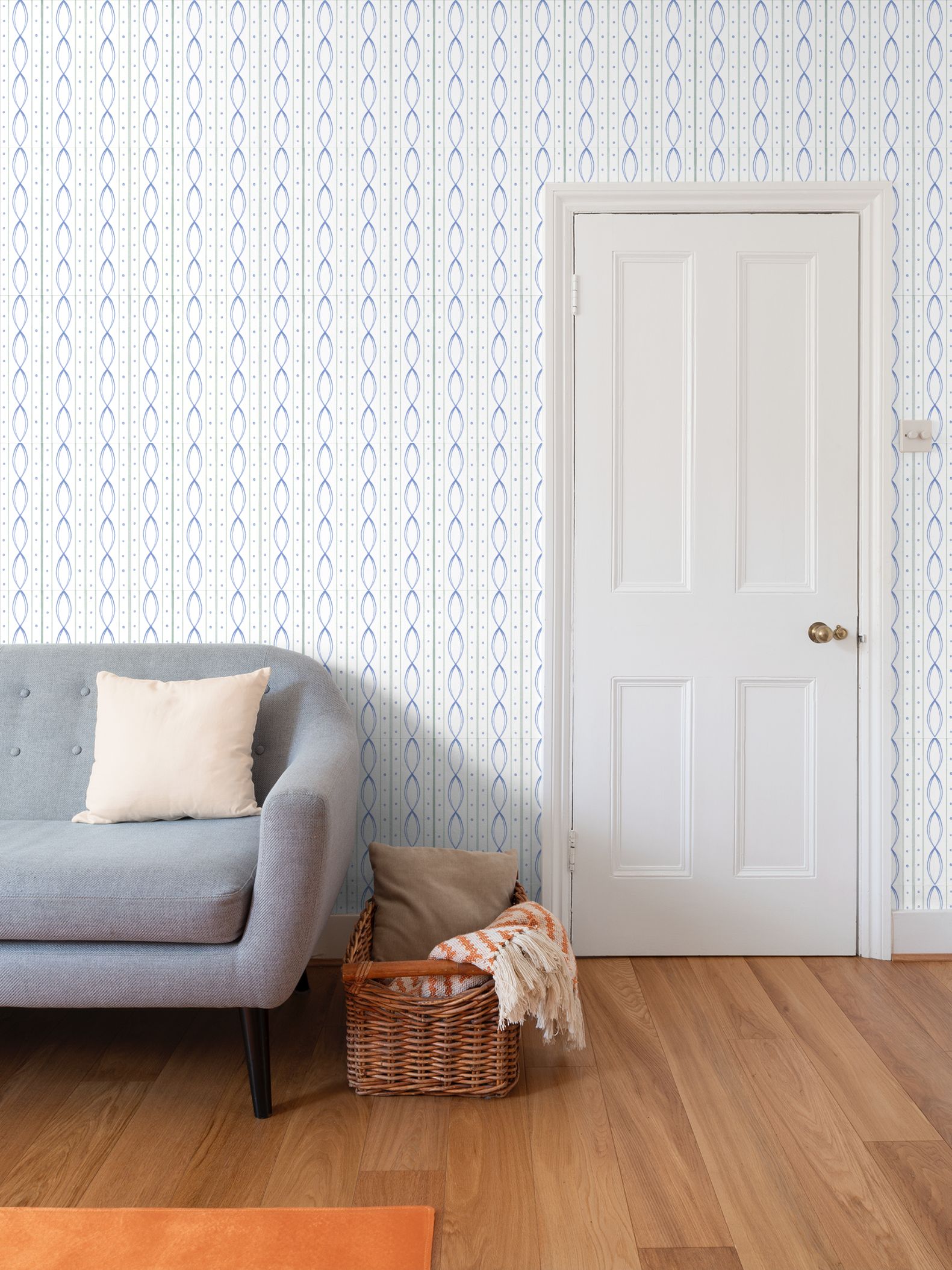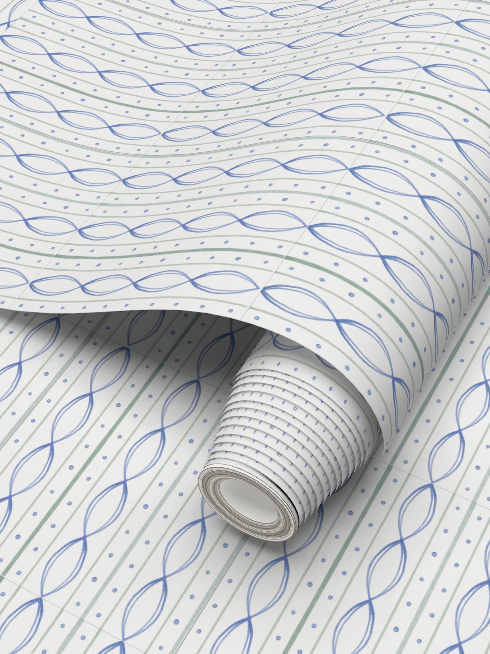 This wallpaper features a crisp white background with vertical lines in alternating shades of soft blue and green. The blue lines form elegant, symmetrical wave-like loops, while the green lines are dotted, creating a rhythmic, airy pattern. The overall look is clean and nautical with a subtle retro charm—perfect for coastal or classic interiors.
