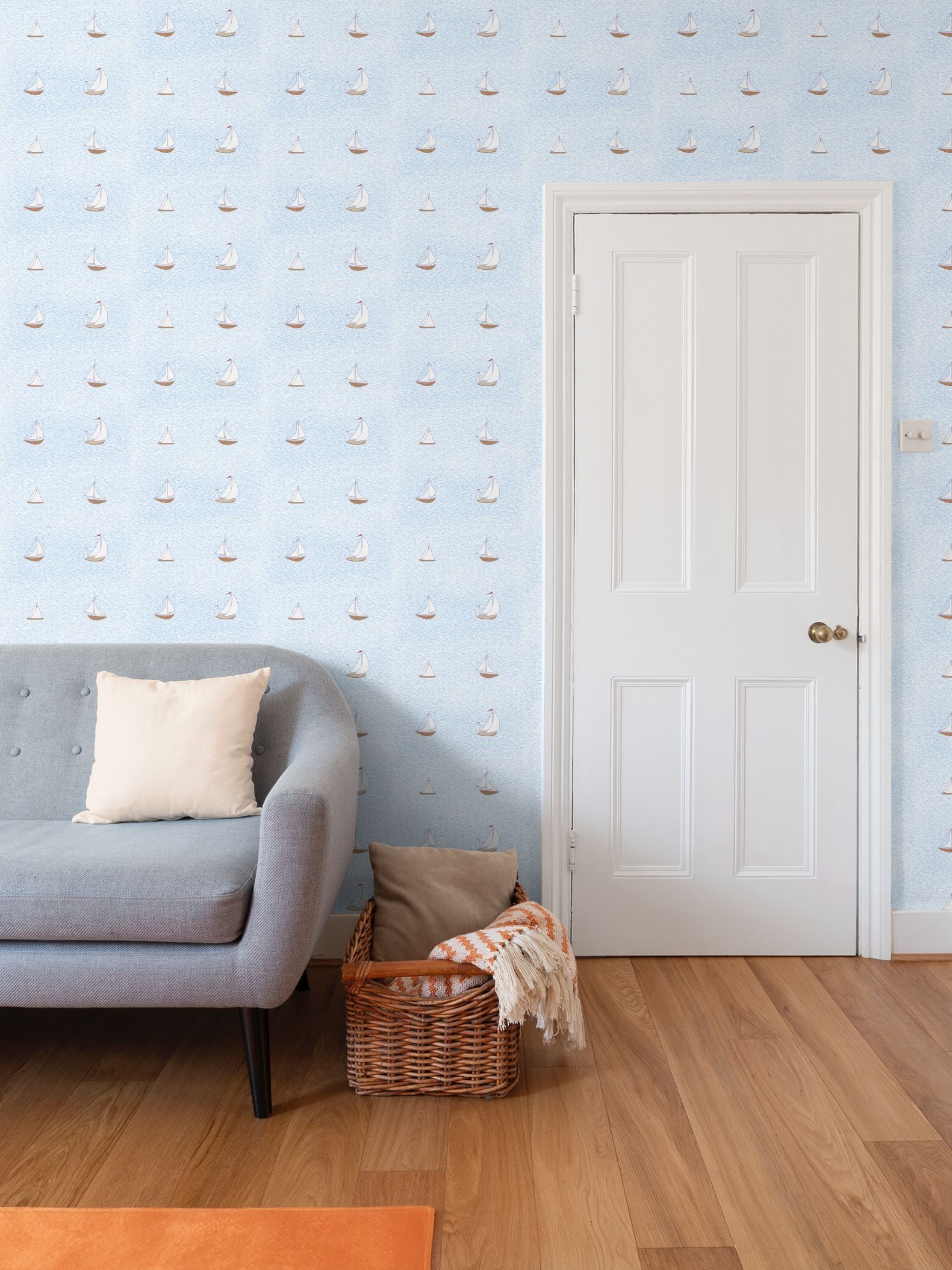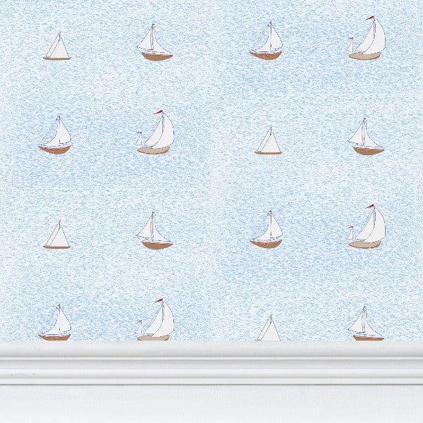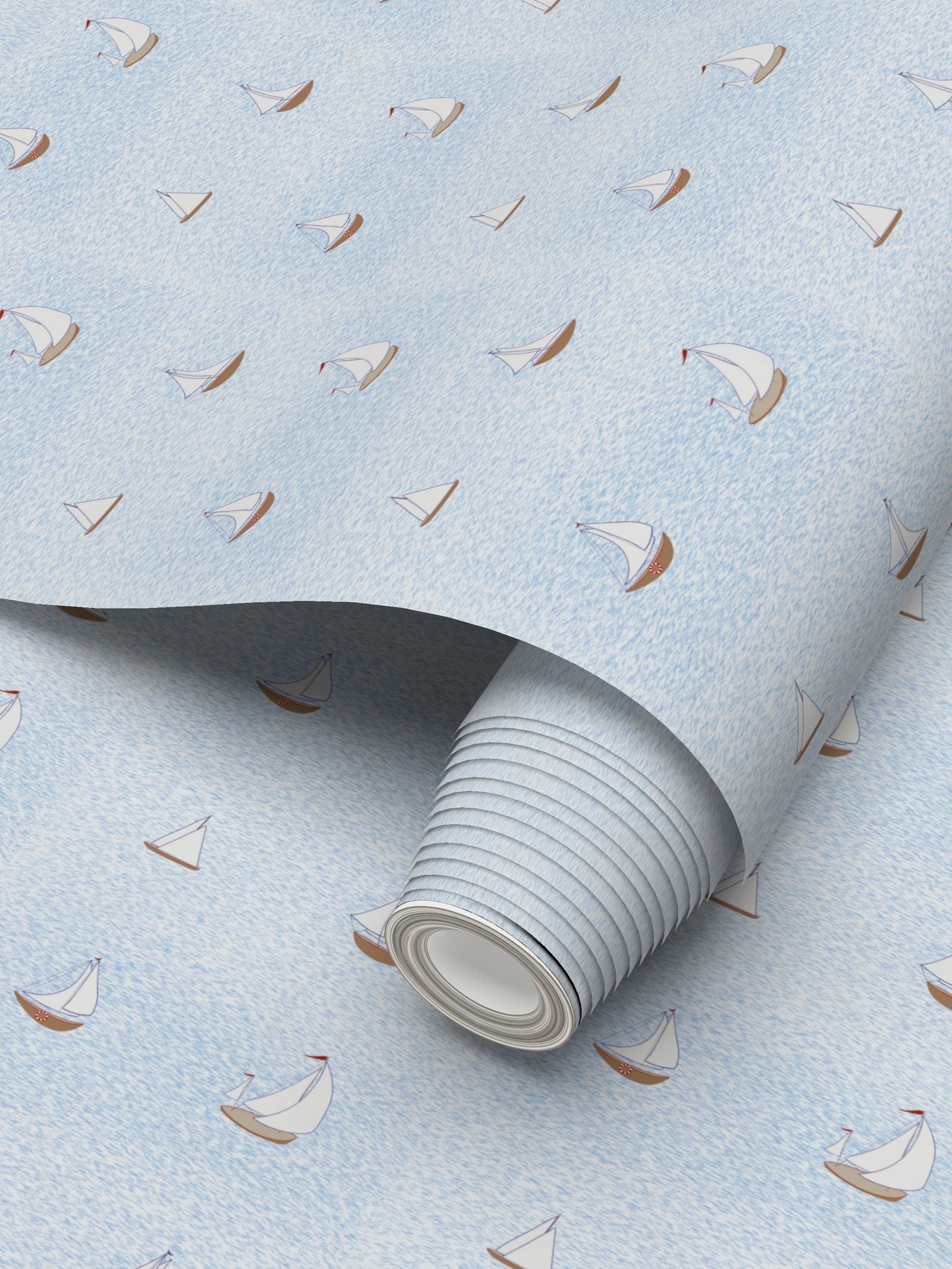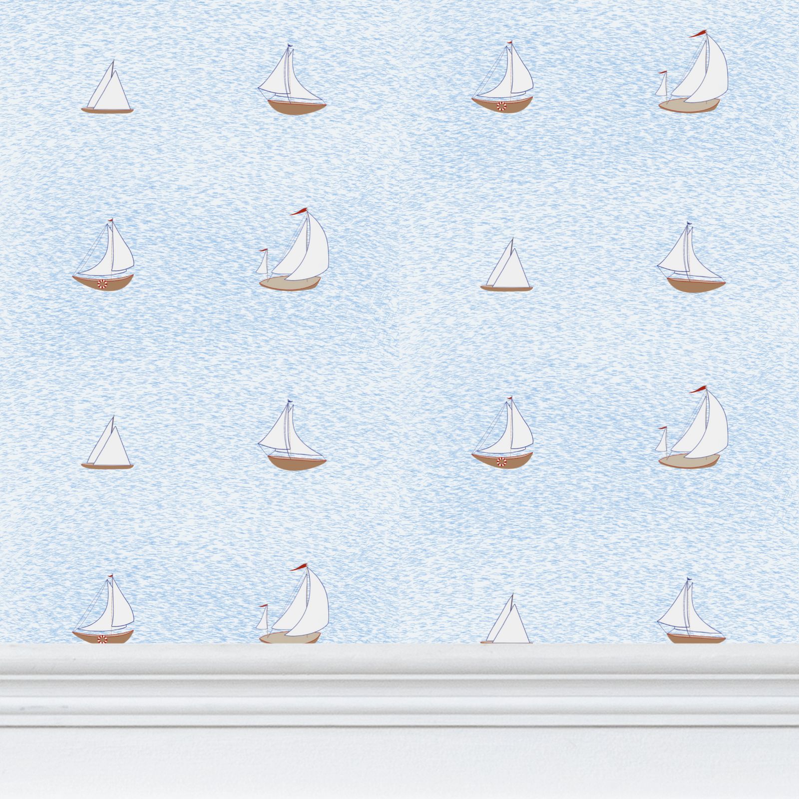A charming nautical wallpaper featuring delicate sailboats drifting across a soft blue sea, perfect for evoking coastal calm and seaside daydreams.